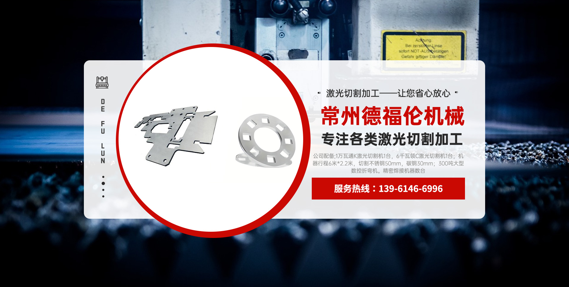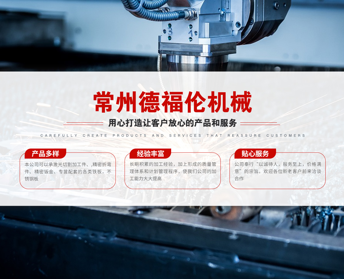 常州德福倫機(jī)械有限公司成立于2014年12月19號,位于江蘇省常州市武進(jìn)區(qū)遙觀鎮(zhèn)建農(nóng)村劍童路56號西門;公司配備;1萬瓦通K激光切割機(jī)1臺,6千瓦領(lǐng)C激光切割機(jī)1臺;機(jī)器行程6米*2.2米,切割不銹鋼50mm,碳鋼30mm;300噸大型數(shù)控折彎機(jī)。精密焊接機(jī)器數(shù)臺。本公司可以承激光切割加工件、,精密折彎件、精密鈑金、專營配套的各類鐵板,不銹鋼板。長期積累的加工經(jīng)驗,加上形成的質(zhì)量管理體系和計劃管理程序,使我們公司的加工能力大大提高,滿足客戶所需,是我們公司的目標(biāo)!公司奉行“以誠待人,服務(wù)為上,價格滿意”的宗旨。歡迎各位領(lǐng)導(dǎo);老總前來洽談合作!